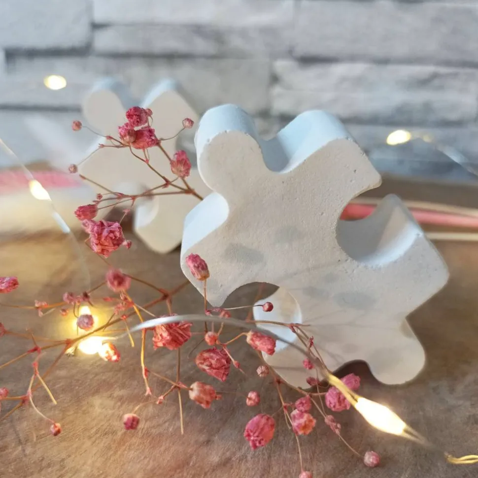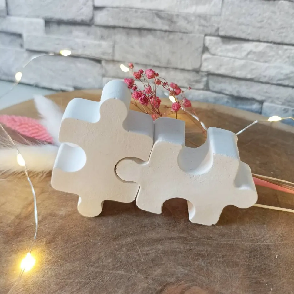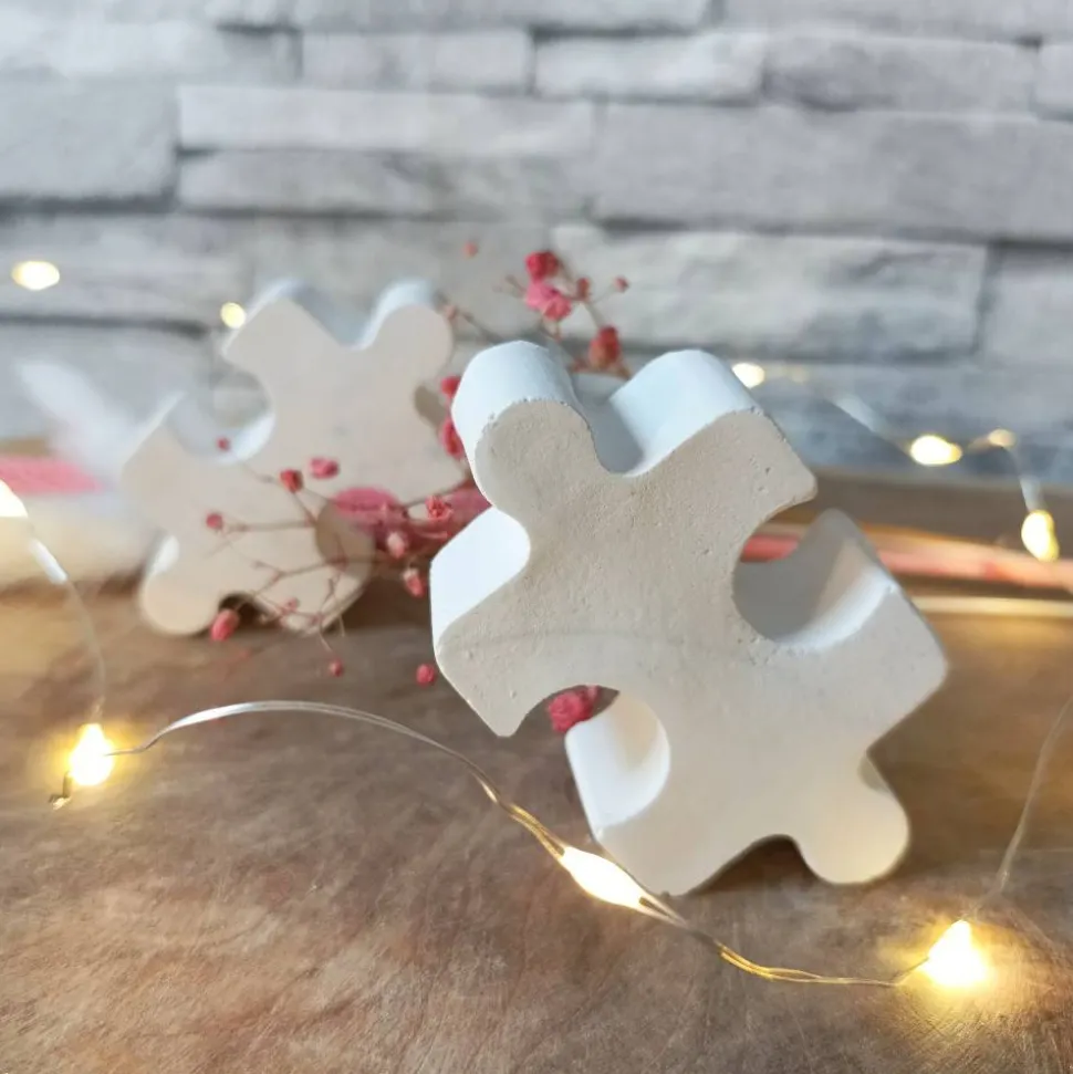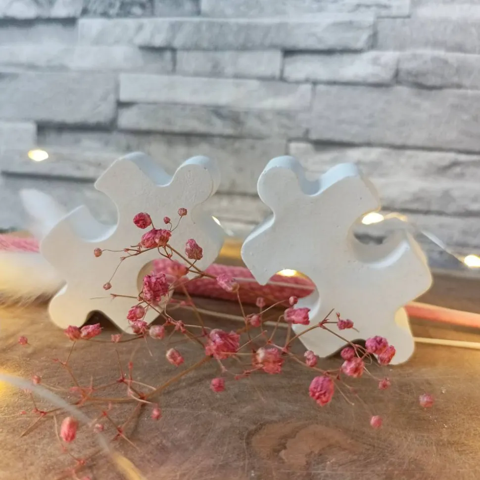 Die Puzzleteile sind aus Raysin oder Keraflott gefertigt, einem hochwertigen, geruchsneutralen Gießpulver auf Gipsbasis. Die leichten Unregelmäßigkeiten und Lufteinschlüsse im Material sind charakteristisch für Raysin-Deko und verleihen jedem Stück seine Einzigartigkeit. Jedes Puzzleteil wird von Hand gefertigt, was minimale Abweichungen vom Produktfoto ermöglicht.