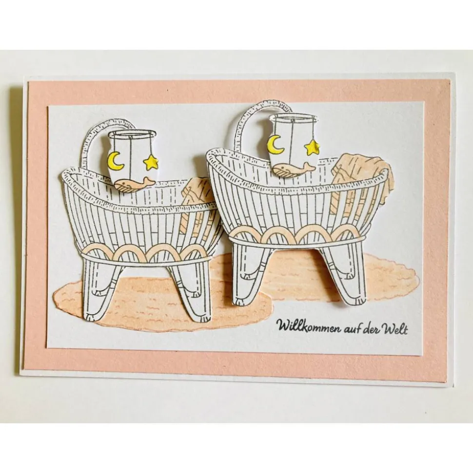 Diese Baby Karte ist gestaltet mit zwei Babywiegen sowie der Aufschrift: